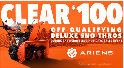 Get $100 off an Ariens Deluxe Sno-Thro® Offer valid 11/6/25 through 12/3/25 while supplies last. Not available for online purchases. This offer applies to U.S. customers only. Offer does not apply to prior purchases. Eligible products include the following model numbers: $100 OFF: Deluxe 24: 921045, 921069Deluxe 28: 921046, 921070Deluxe 28 SHO: 921048, 921072Deluxe 30: 921047, 921071