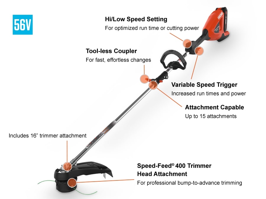Lightweight lightning. The DPAS-2100SB powerhead, powered by the ECHO eFORCE® 56V battery system, includes a Speed-Feed® 400 trimmer head attachment. Featuring legendary ECHO power and do-it-all versatility, the powerhead quickly connects to 15 available PAS attachments.